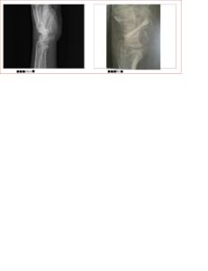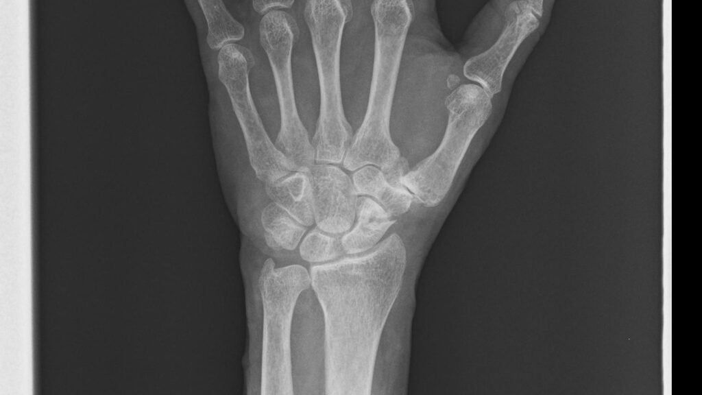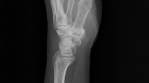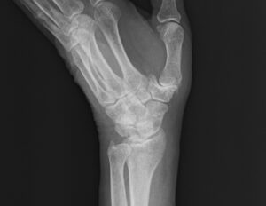 下図は手術前の左手レントゲン写真で、中央の船状骨が砕けている様子が見える。